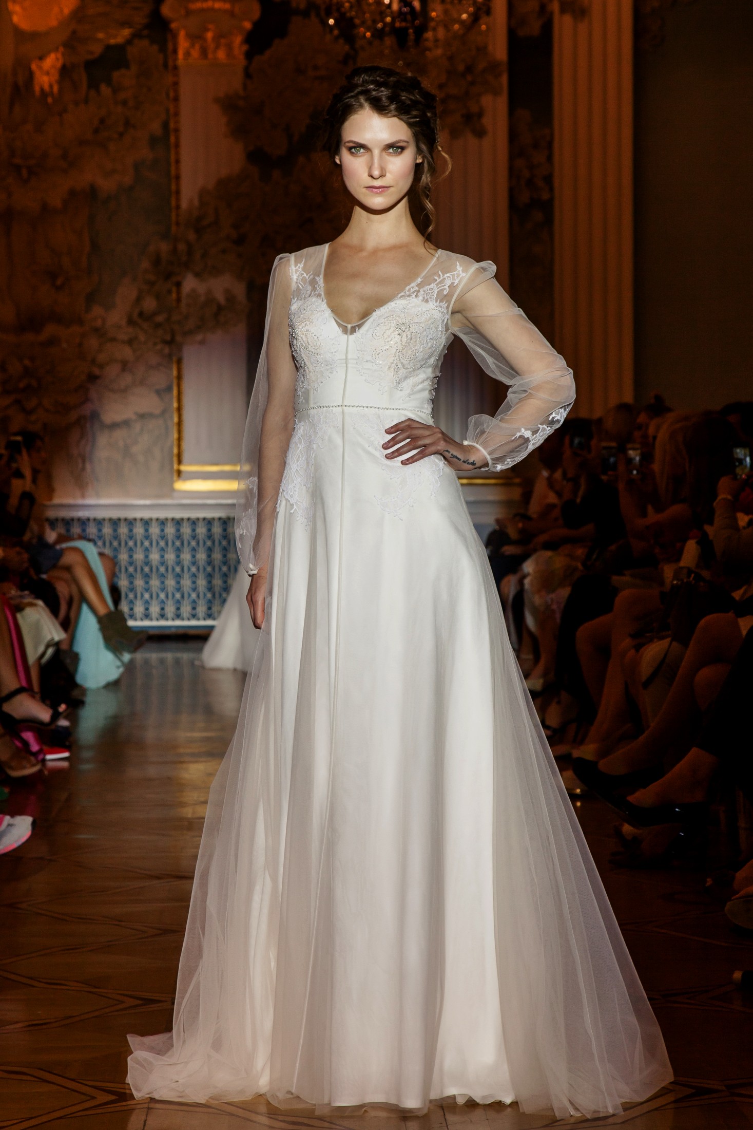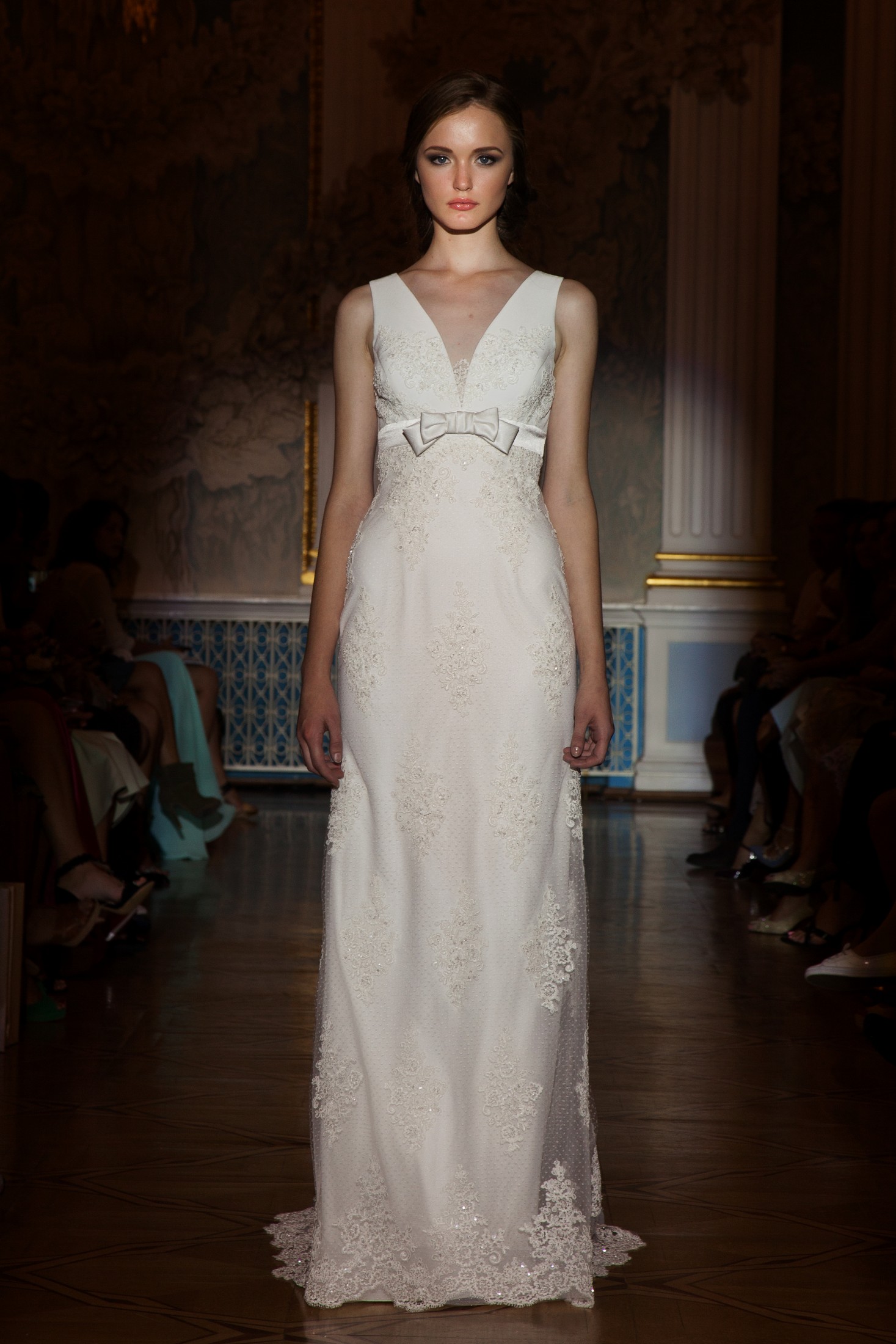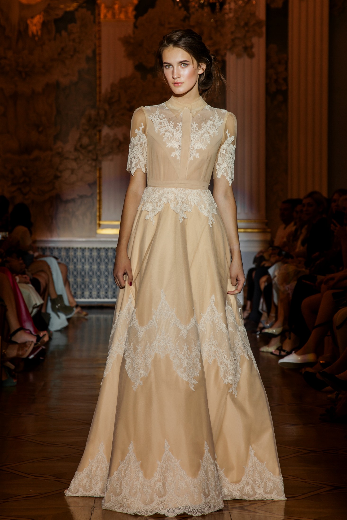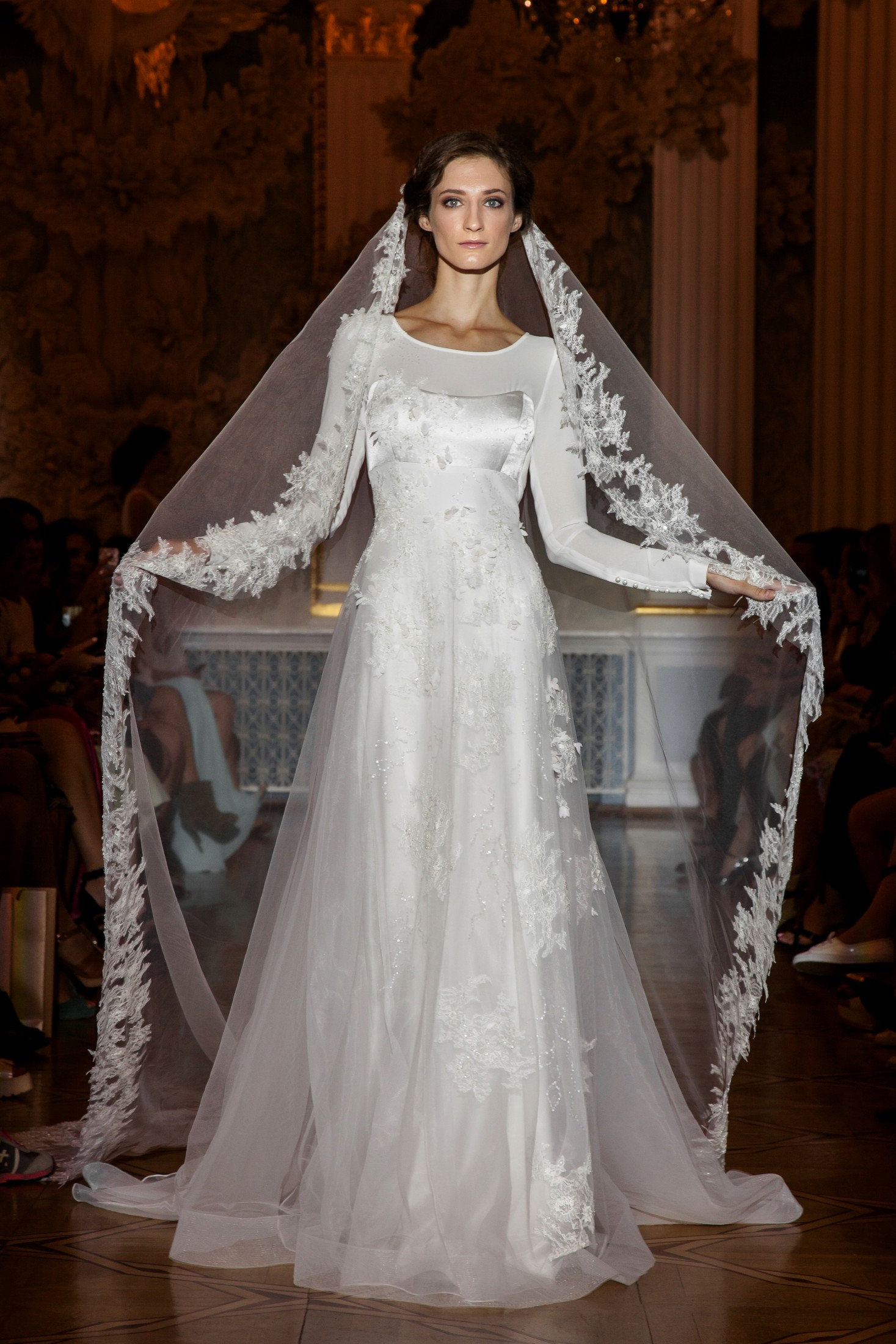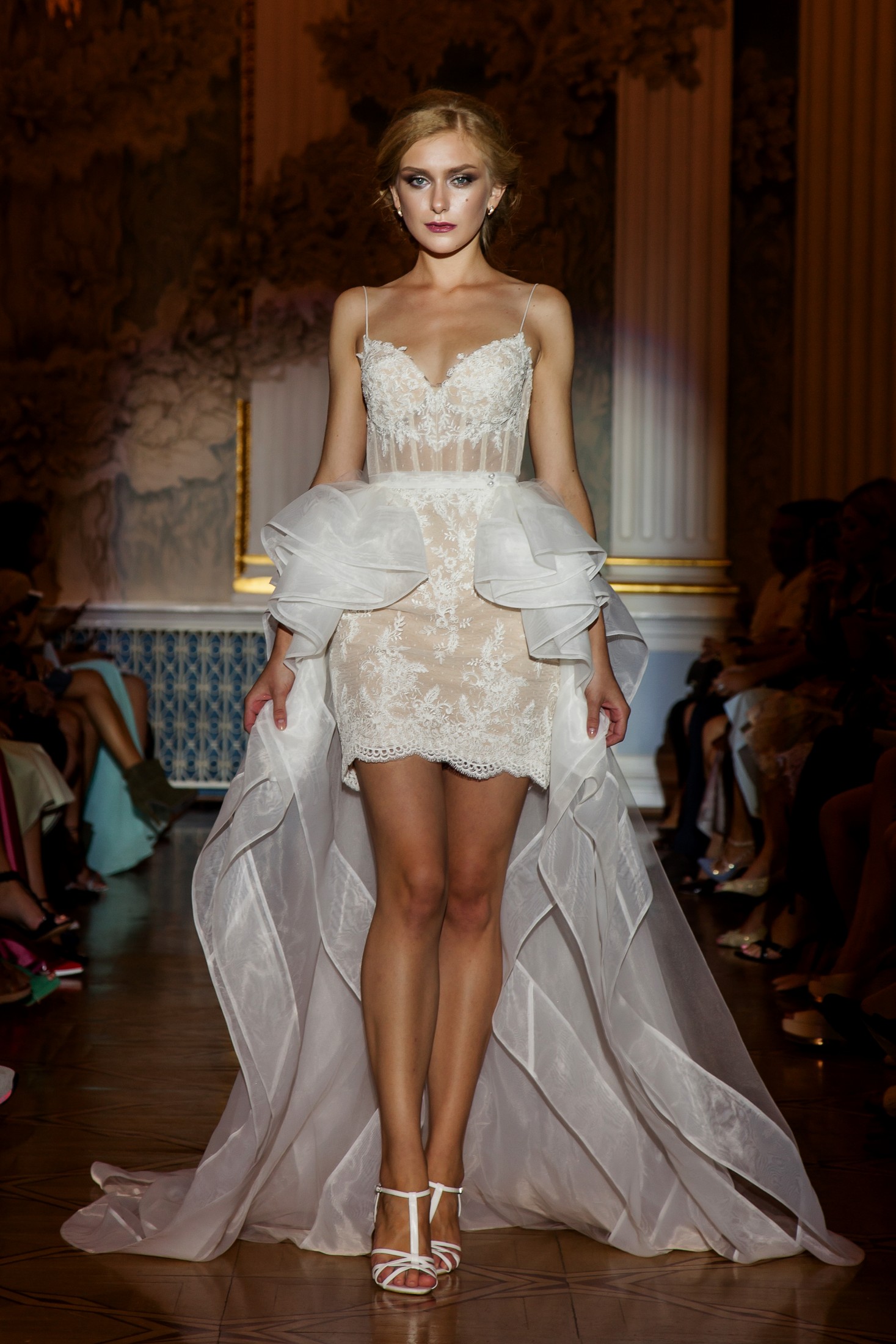 Несмотря на то, что показ Papilio длился дольше обычного, у зрителей не возникло ощущение, что им снова и снова демонстрируют один и тот же наряд с едва заметными изменениями декора, как это часто случается с bridal-шоу. Практически каждый выход нес на себе значительный и очевидный отпечаток аутентичности, отчего внимание гостей показа было непрерывно приковано к происходящему на подиуме. Свадебные платья сменялись элементами шоу «подружки невесты», «девишник» и «family look» и опять возвращаясь к церемониальному «wedding catwalk». Вечерняя коллекция также порадовала зрителей и цветовым всплеском: бескомпромиссный алый, королевский синий, благородный изумрудный и бросающий вызов черный наряду с куда более аристократическими пудрово-каменными и кремовыми оттенками, и разнообразием фасонов и текстур!