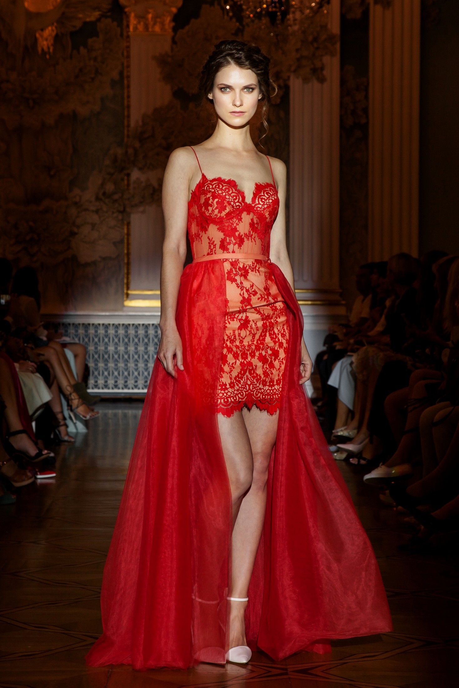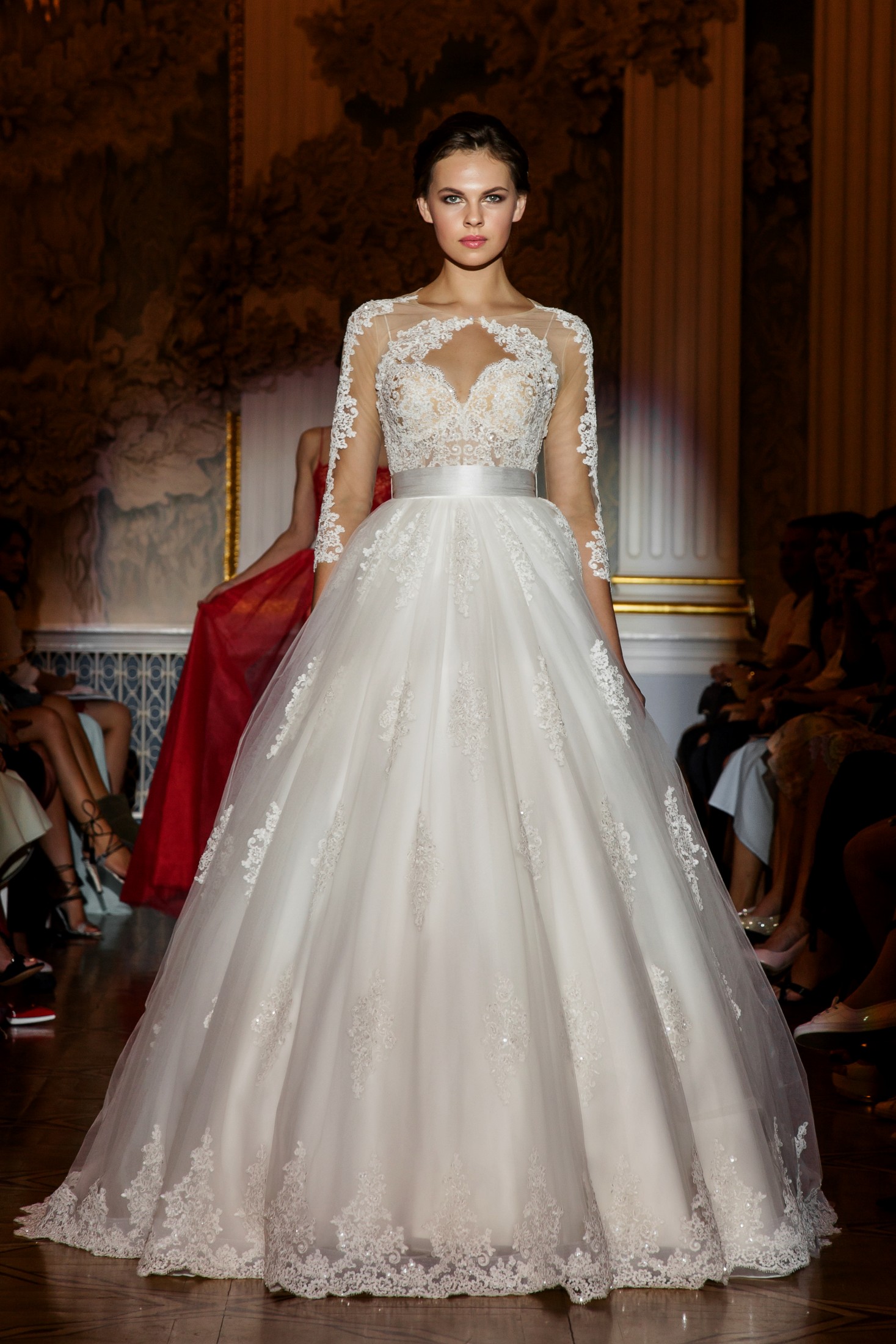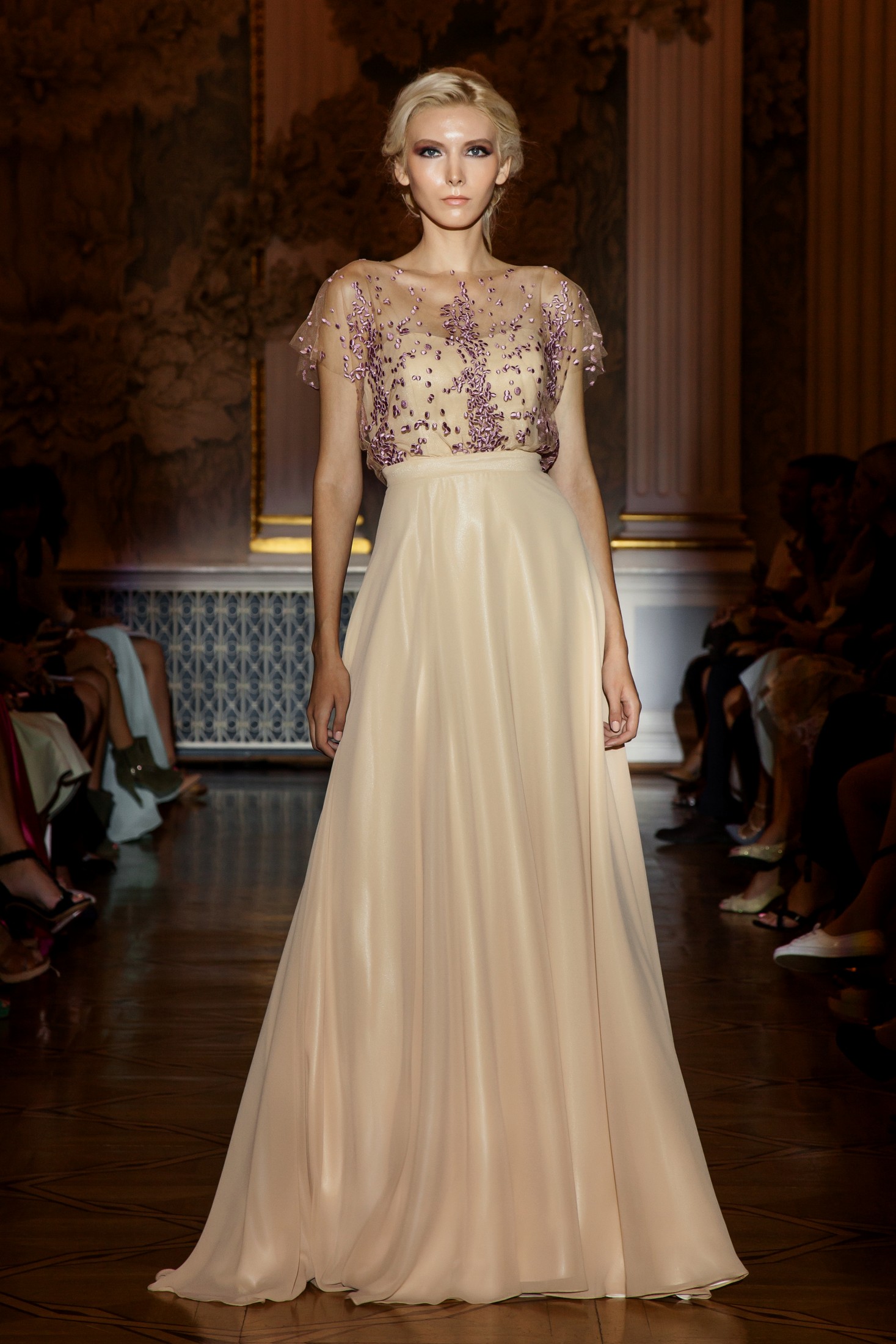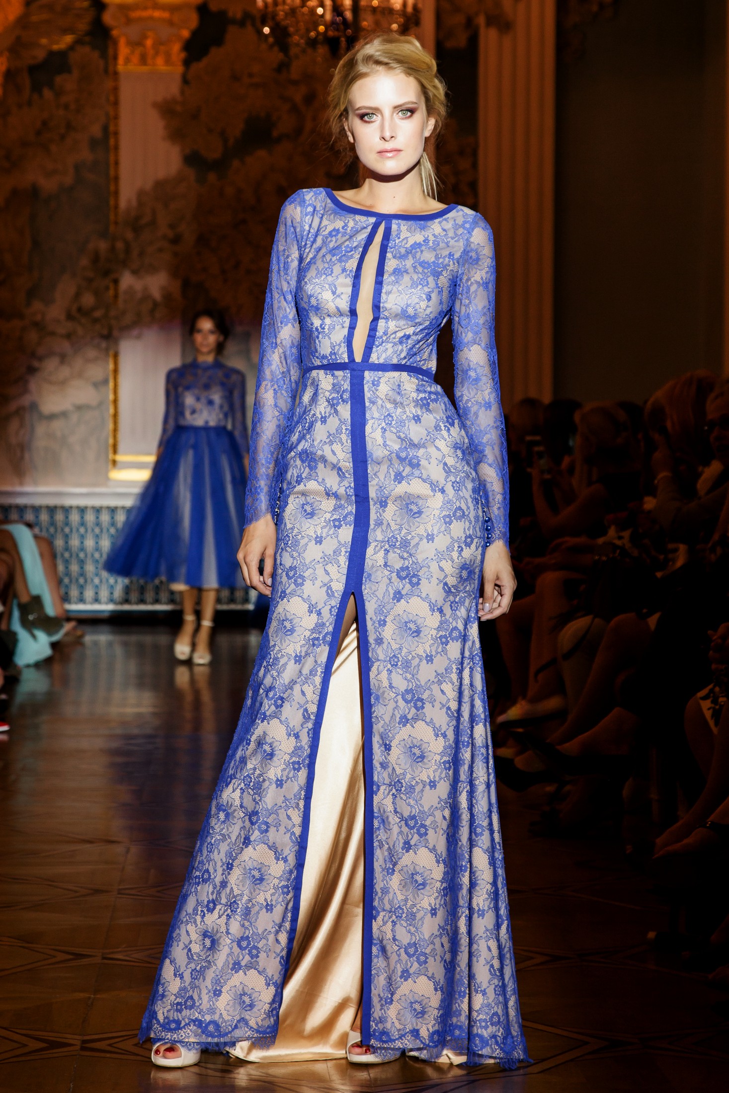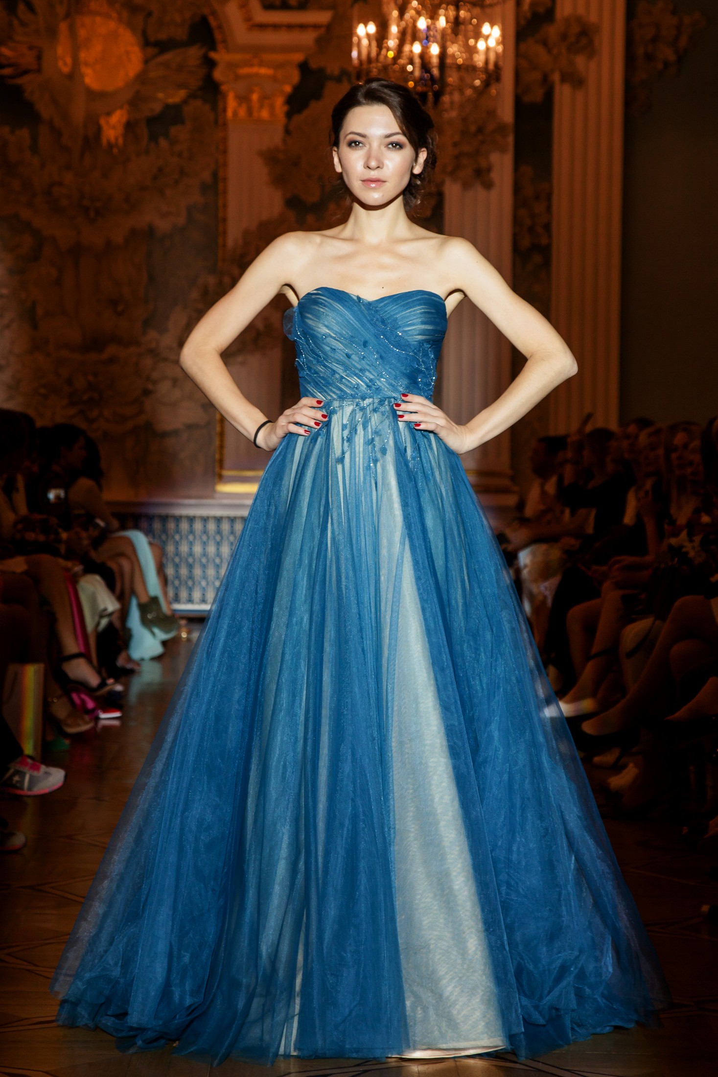 Несмотря на то, что показ Papilio длился дольше обычного, у зрителей не возникло ощущение, что им снова и снова демонстрируют один и тот же наряд с едва заметными изменениями декора, как это часто случается с bridal-шоу. Практически каждый выход нес на себе значительный и очевидный отпечаток аутентичности, отчего внимание гостей показа было непрерывно приковано к происходящему на подиуме. Свадебные платья сменялись элементами шоу «подружки невесты», «девишник» и «family look» и опять возвращаясь к церемониальному «wedding catwalk». Вечерняя коллекция также порадовала зрителей и цветовым всплеском: бескомпромиссный алый, королевский синий, благородный изумрудный и бросающий вызов черный наряду с куда более аристократическими пудрово-каменными и кремовыми оттенками, и разнообразием фасонов и текстур!
