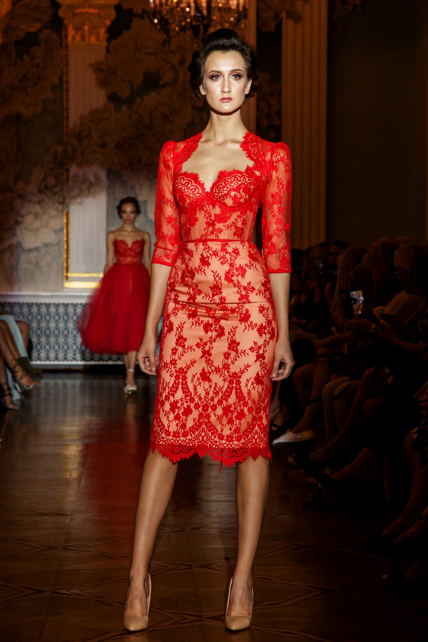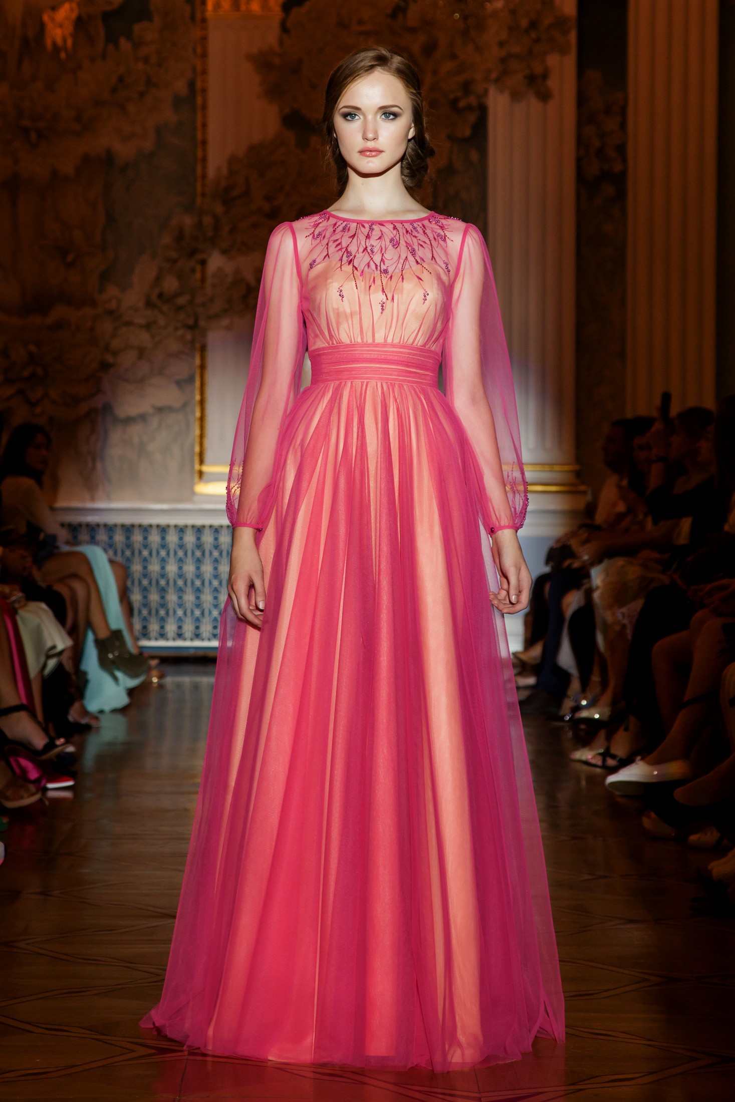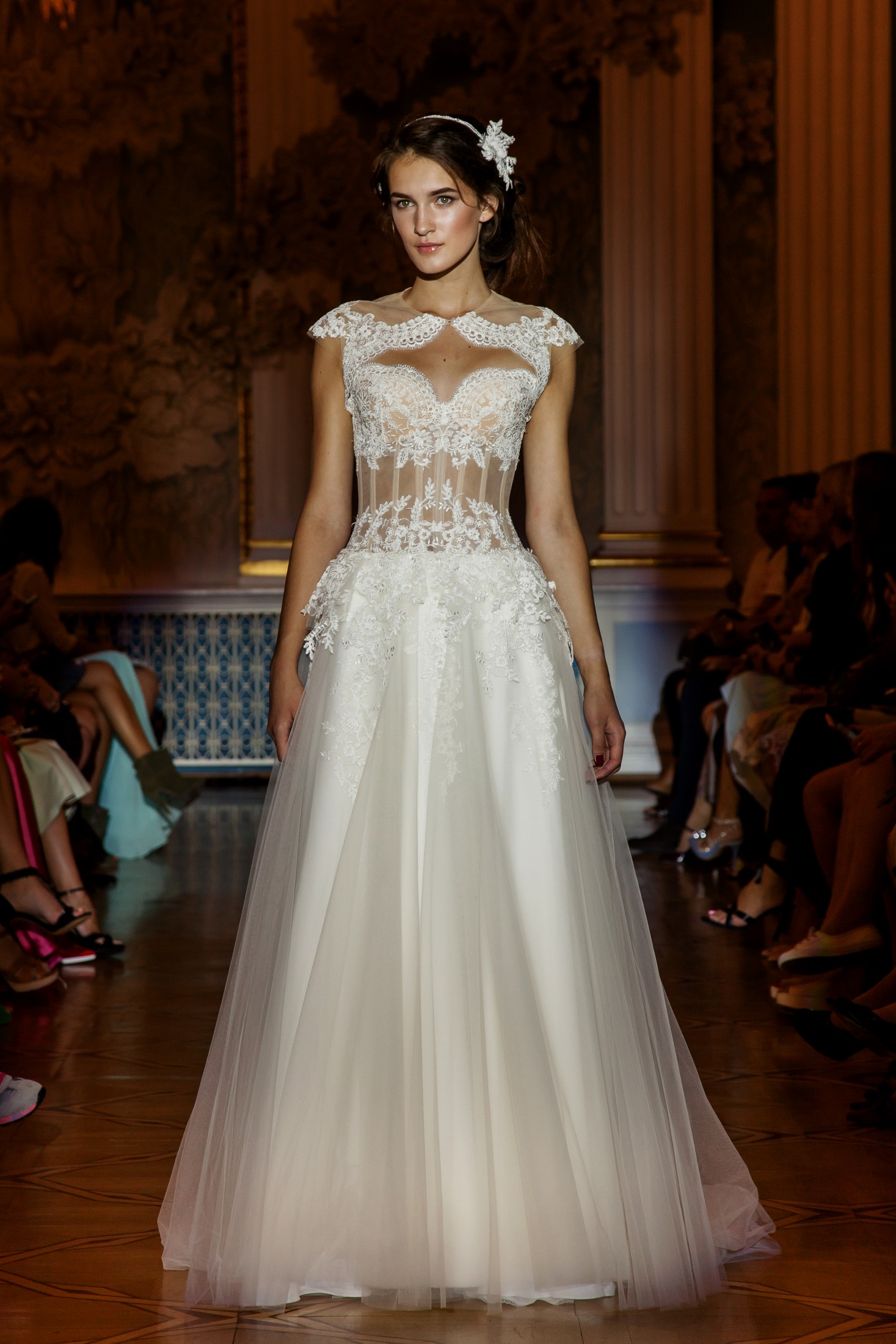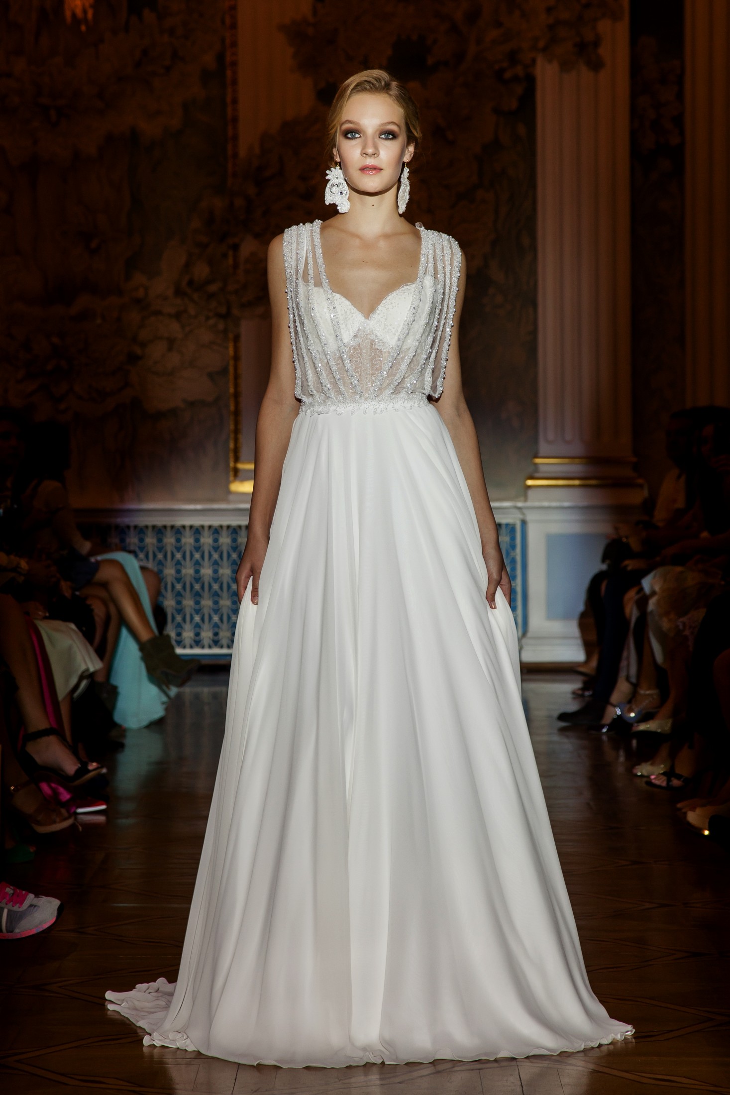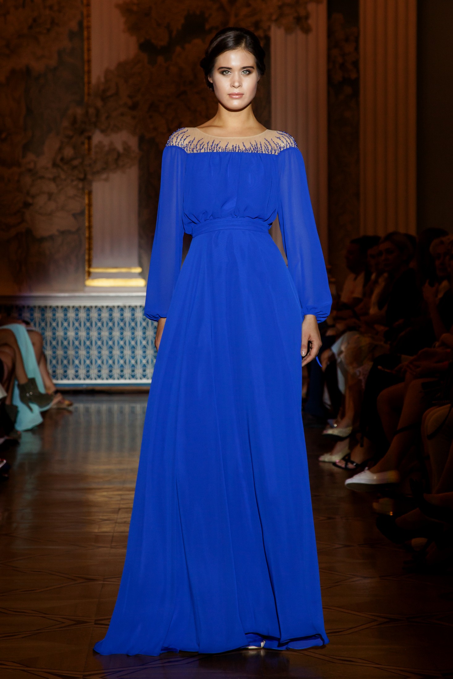 Несмотря на то, что показ Papilio длился дольше обычного, у зрителей не возникло ощущение, что им снова и снова демонстрируют один и тот же наряд с едва заметными изменениями декора, как это часто случается с bridal-шоу. Практически каждый выход нес на себе значительный и очевидный отпечаток аутентичности, отчего внимание гостей показа было непрерывно приковано к происходящему на подиуме. Свадебные платья сменялись элементами шоу «подружки невесты», «девишник» и «family look» и опять возвращаясь к церемониальному «wedding catwalk». Вечерняя коллекция также порадовала зрителей и цветовым всплеском: бескомпромиссный алый, королевский синий, благородный изумрудный и бросающий вызов черный наряду с куда более аристократическими пудрово-каменными и кремовыми оттенками, и разнообразием фасонов и текстур!