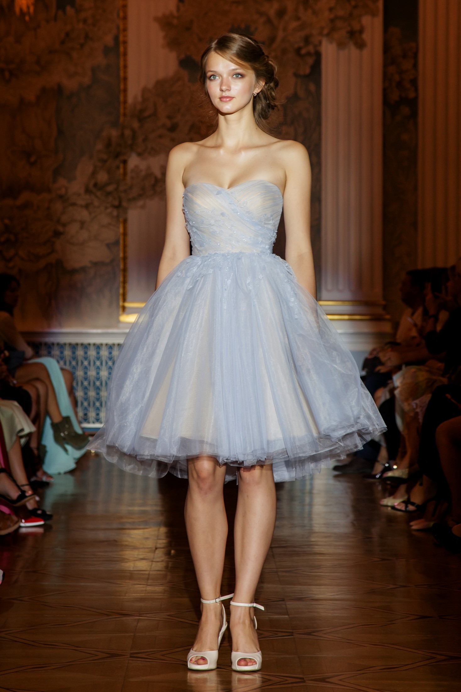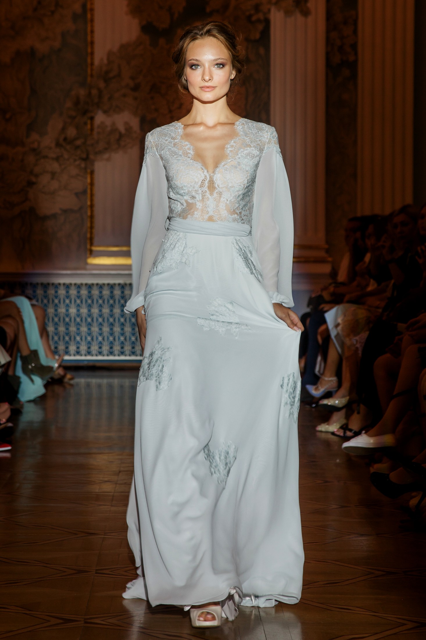 Дизайнер, определенно,не боится цвета и раздвигает колористические рамки bridal-коллекций, предлагая прекрасным покупательницам пастельно-пыльную цветовую гамму, представленной нежно-голубым, пудрово-розовым, кремовым и серым оттенками. Впрочем, несмотря на разнообразие цветовой палитры, классический лайт-айвери играет в показе первую скрипку.