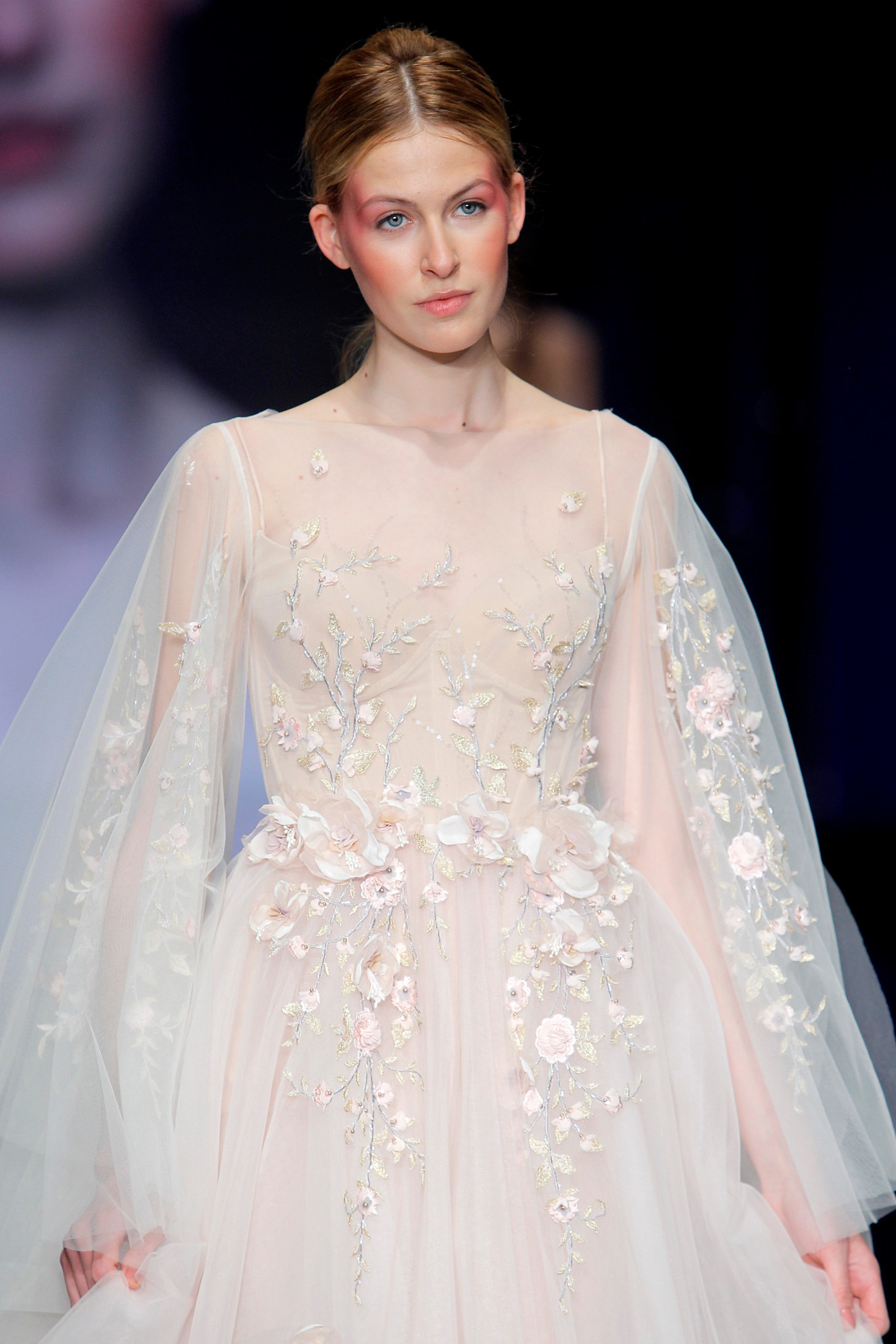 Как и сами платья, которые будто сошли с полотен художников, образы моделей были также вдохновлены импрессионизмом. Лица послужили неким холстом: “нарисованные” губы, глаза, ресницы, макияж в виде ярких мазков - эти интересные стилевые решения помогли подчеркнуть живописное направление в искусстве и создать для моделей романтичные, трогательные образы.